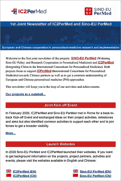 The projects Sino-EU PerMed and IC2PerMed funded by the European Commission have published a joint newsletter on European and Chinese communication and cooperation in research and implementation on personalised medicine. The newsletter provides information on the joint kick-off meeting, the websites of the two projects in English and Chinese, the mapping of personalised medicine expertise in the two regions, and current and upcoming activities. You can find the newsletter on the projects' websites: